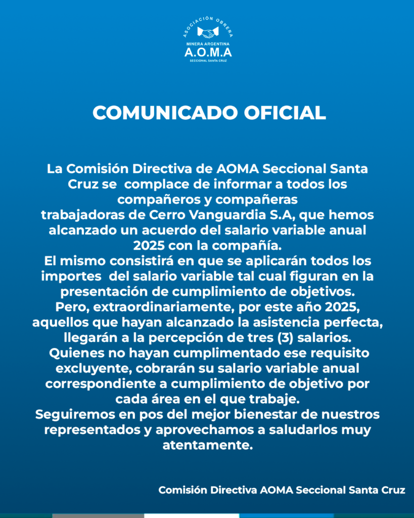 La Comisión Directiva de AOMA Seccional Santa Cruz se complace de informar a todos los compañeros y compañeras trabajadoras de Cerro Vanguardia S.A, que hemos alcanzado un acuerdo del salario variable anual 2025 con la compañía.